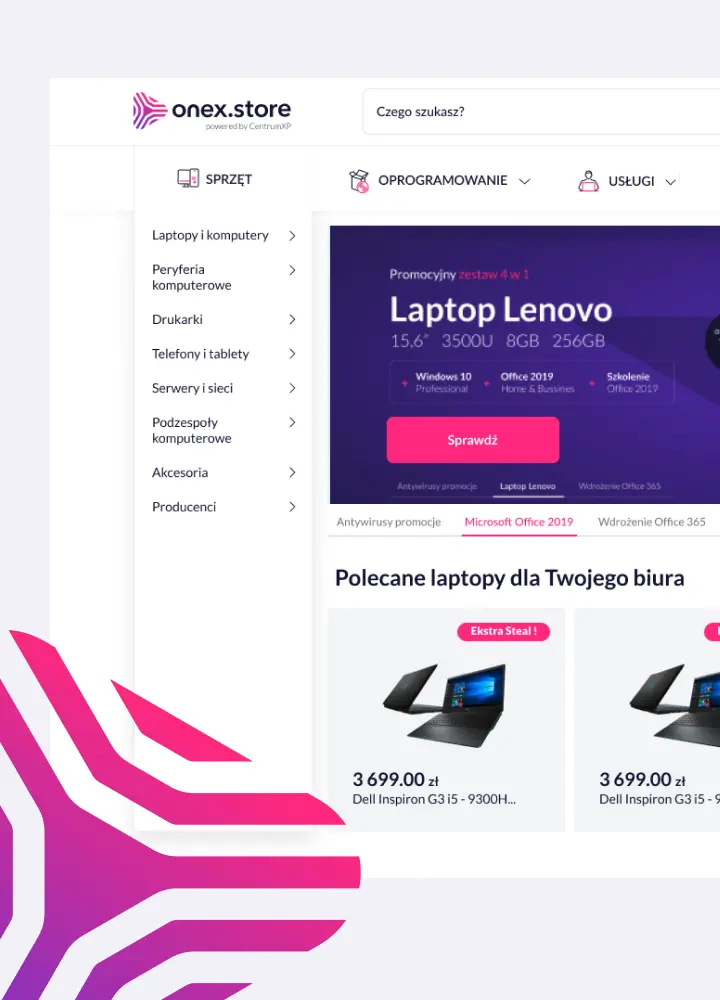 Commissioned by OnexGroup, we created the concept for their online store. The starting point was the idea/concept. We carried out the entire design process, from analysis through UX all the way to UI designs. In the next phase, we coded the whole front-end of the shop, which was then handed over to the internal back-end team. As part of the project, we provided the client with a design and development team. The work lasted for approximately four months. Once the project is handed over, it is being further developed and modified by the internal team. Our involvement is currently limited to periodic UX/UI consultations and audits.